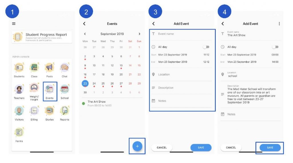 Events in Oodlins allows schools to insert the school semester break, public holidays, events and special activities. Therefore, parents will be able to plan the children’s activities ahead.