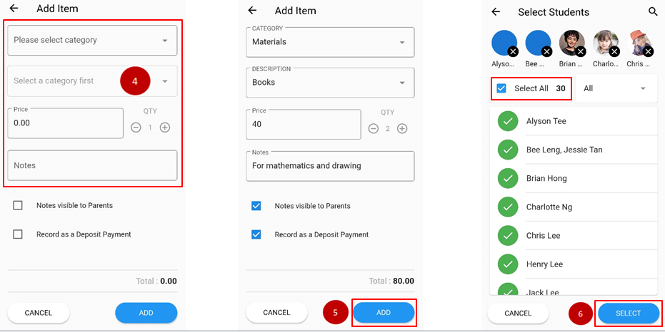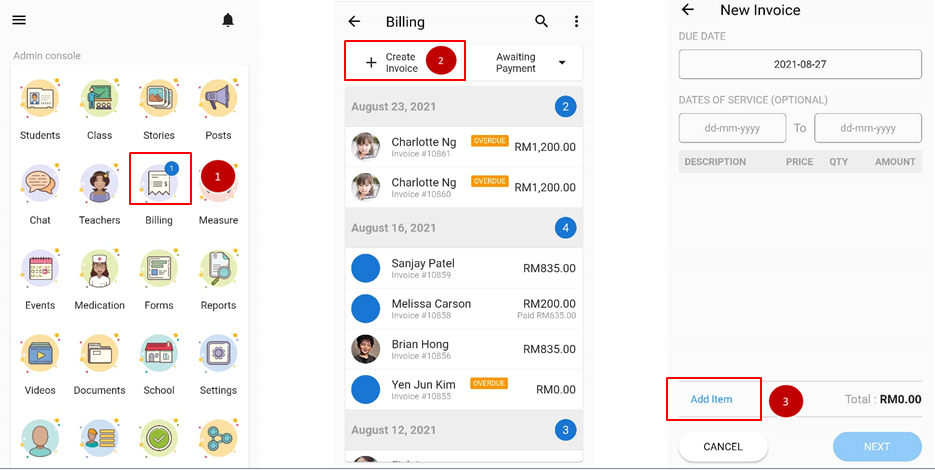 - Fill in the details of the bill on the category, the amount needed to be paid and remarks for parents’ reference.