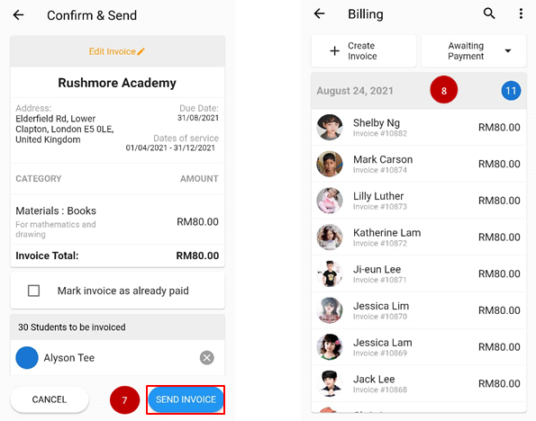 - Review the invoice details and mark the box if the parents paid before the invoice is created. Click Send Invoice when done.