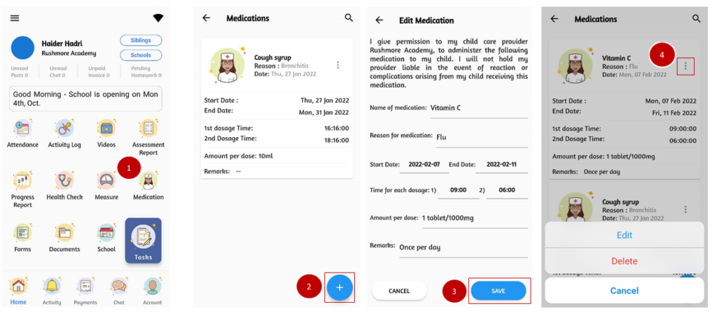 - Fill in the Name of medication, Reason, Start and End date, Time and Amount of each dosage, and Remarks. Click save when done.