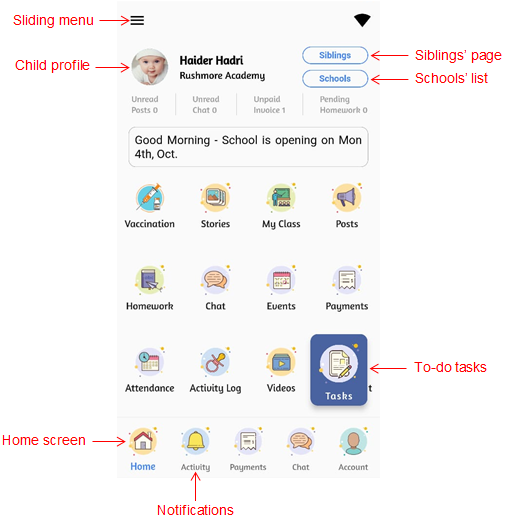 - Home screen displays all the available modules that the school have made available to the parents to use. There is the core of all the engagement between the teacher and the child’s parent.