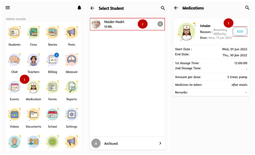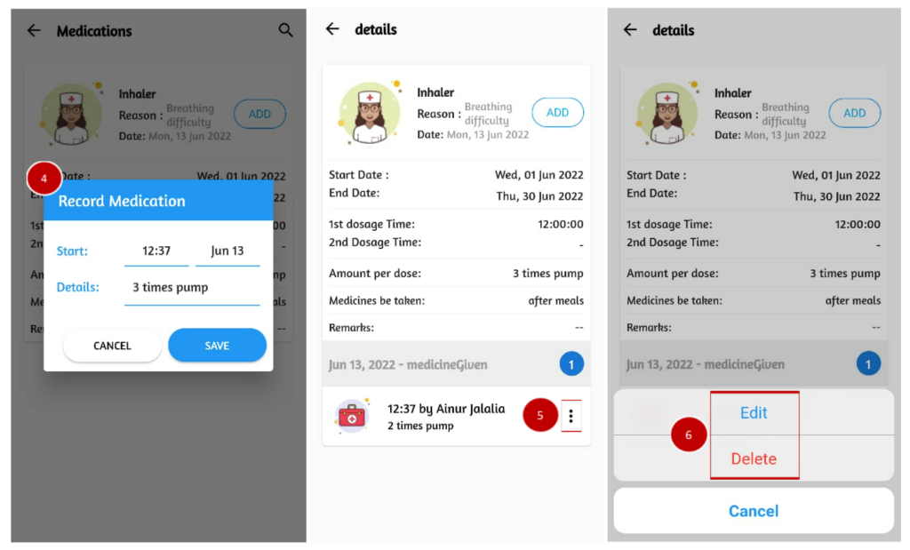 - Tap on the medication details to see the record(s) made. Click on the triple dot icon to make changes.