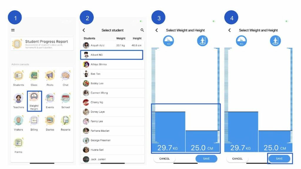 Our easy-to-use Weight and Height feature is designed for teachers to record and track the childrens’ growth. Allowing parents to monitor their child’s growth.