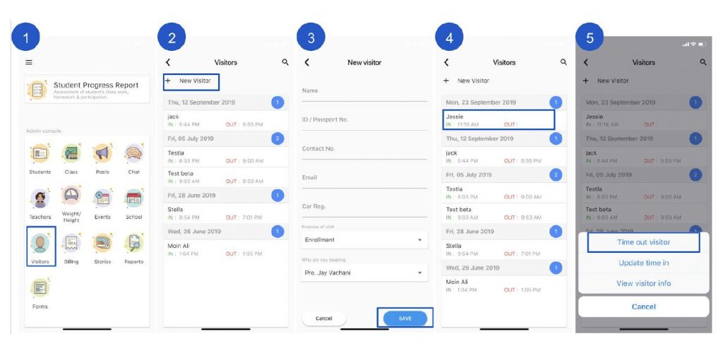 - Upon visitor left school area, click on the visitor name and click time out time to complete time out process.