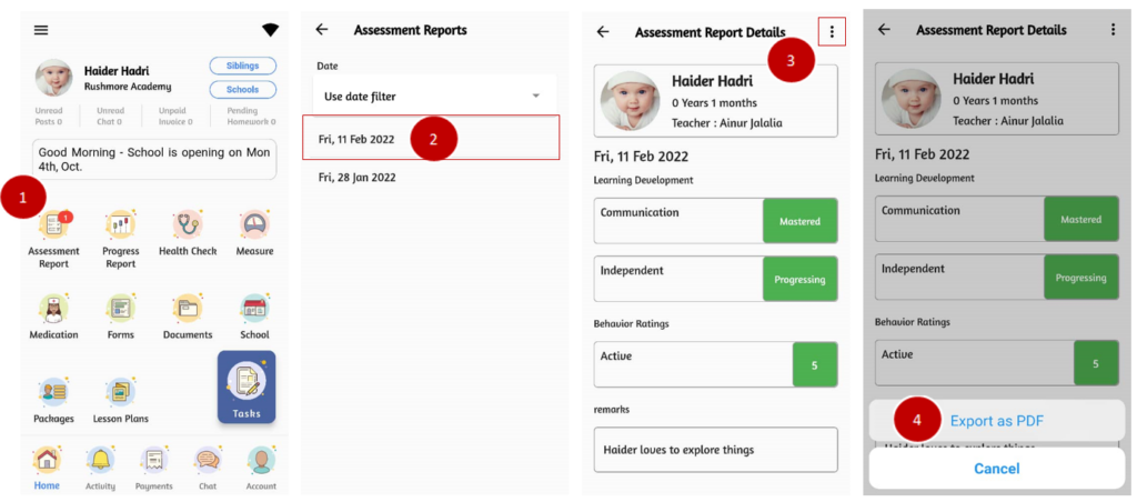 Parents can check child’s daily behaviour and development through assessment report. Oodlins parent app presents the reports made by teachers for parents to look over.