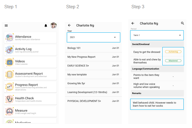 - The report will be updated by the school either the student is developing, achieving or mastered the task.