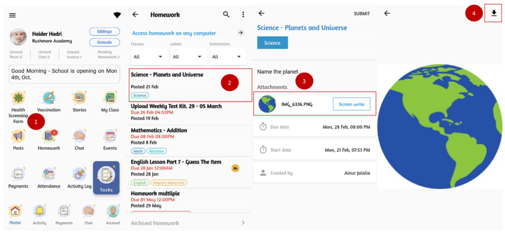 Parents can keep up to date with the homework assigned by teachers and download the attachment